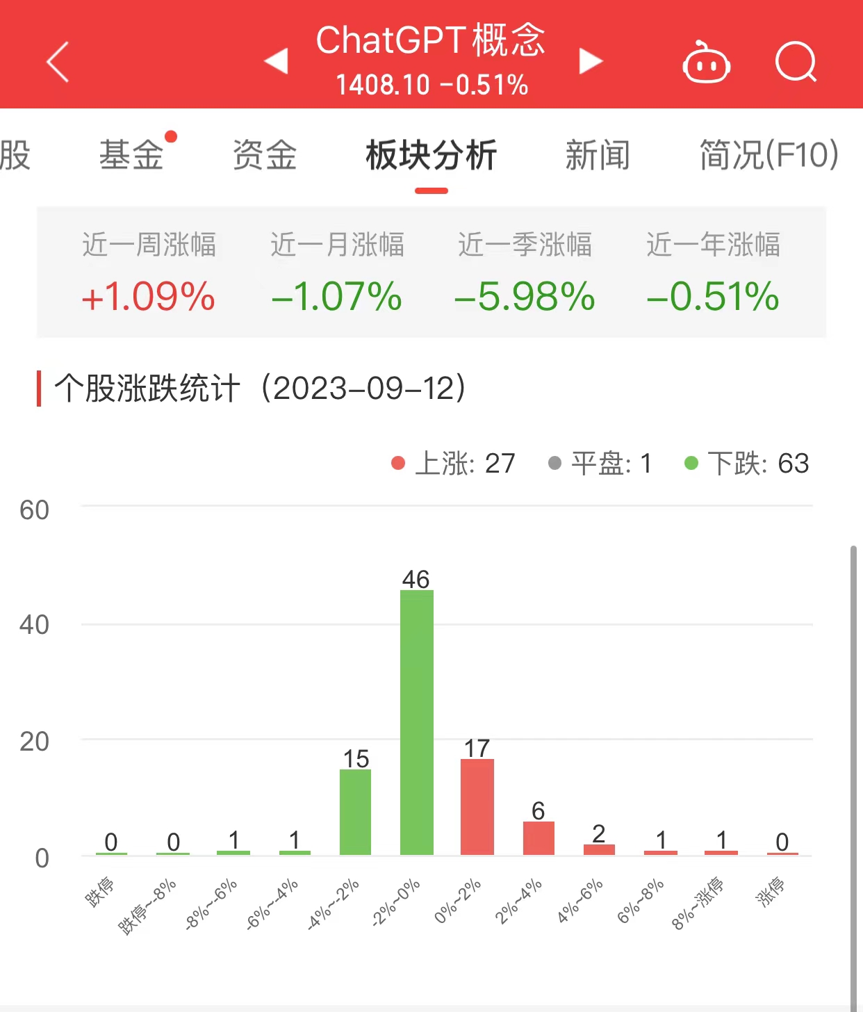 中国经济网北京9月12日讯今日,ChatGPT概念板块整体跌幅0.51%,其中27只股票上涨,1只股票平盘,63只股票下跌。