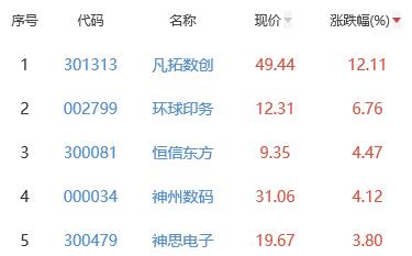 其中,凡拓数创、环球印务、恒信东方、神州数码、神思电子位列板块涨幅前五位,涨幅分别为12.11%、6.76%、4.47%、4.12%、3.80%。