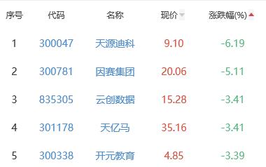 天源迪科、因赛集团、云创数据、天亿马、开元教育位列涨幅榜后五位,涨幅分别为-6.19%、-5.11%、-3.41%、-3.41%、-3.39%。