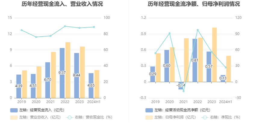 2024年上半年,公司营业收入现金比为88.77%,净现比为27.17%。