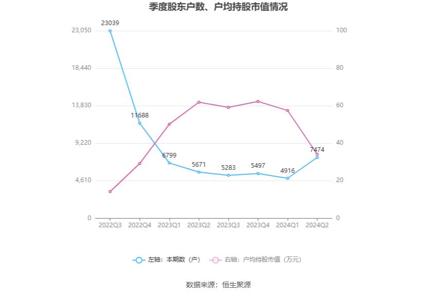 筹码集中度方面,截至2024年上半年末,公司股东总户数为7474户,较一季度末增长了2558户,增幅52.03%;户均持股市值由一季度末的57.49万元下降至34.16万元,降幅为40.58%。