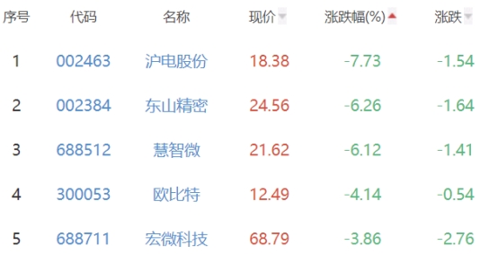 沪电股份、东山精密、慧智微、欧比特、宏微科技位列涨幅榜后五位,涨幅分别为-7.73%、-6.26%、-6.12%、-4.14%、-3.86%。