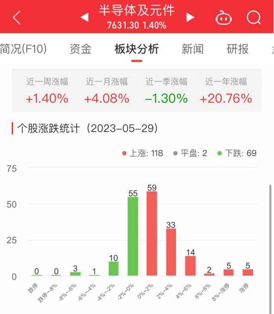 中国经济网北京5月29日讯今日,半导体及元件板块整体涨幅1.40%,其中118只股票上涨,2只股票平盘,69只股票下跌。