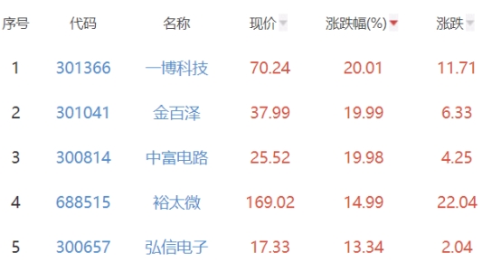 其中,一博科技、金百泽、中富电路、裕太微、弘信电子位列板块涨幅前五位,涨幅分别为20.01%、19.99%、19.98%、14.99%、13.34%。
