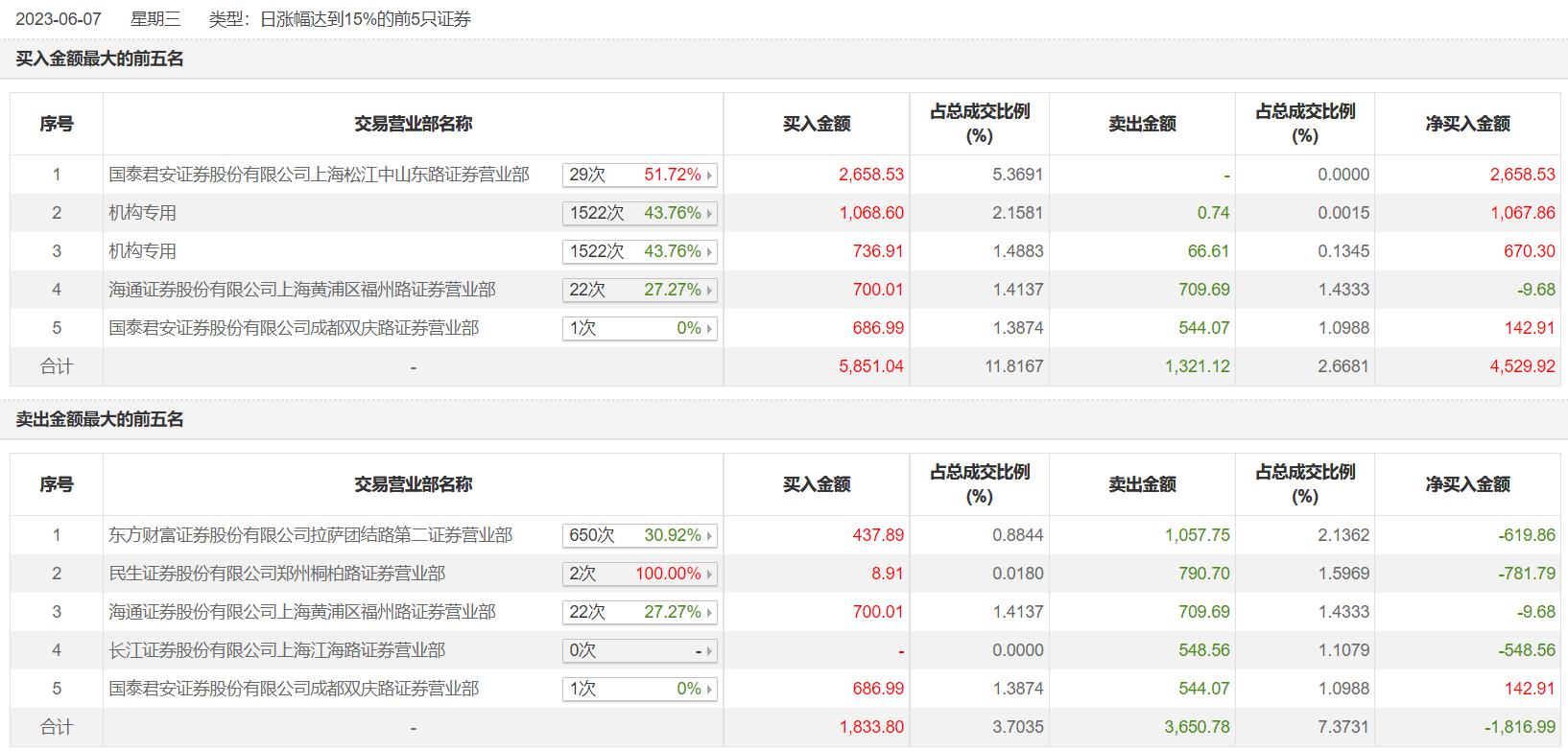 具体来看,机构买入1805.51万元,卖出67.36万元,合计净买入1738.15万元。此外,国泰君安证券上海松江中山东路证券营业部、海通证券上海黄浦区福州路证券营业部分别买入2658.53万元、700.01万元;东方财富证券拉萨团结路第二证券营业部、民生证券郑州桐柏路证券营业部分别卖出1057.75万元、790.70万元。