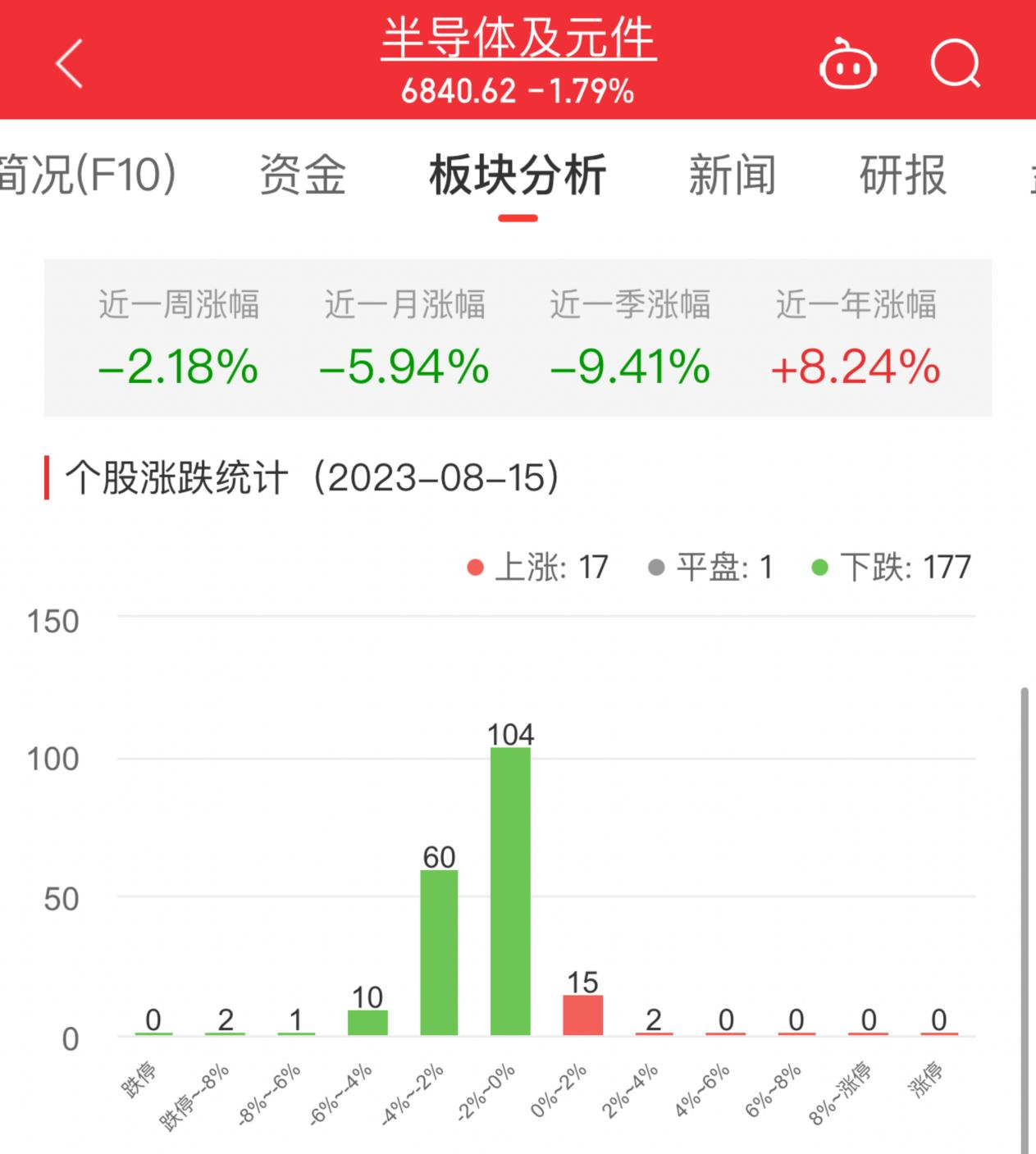 中国经济网北京8月15日讯 今日,半导体及元件板块整体跌幅1.79%,其中17只股票上涨,1只股票平盘,177只股票下跌。
