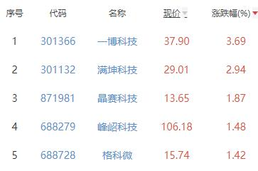 其中,一博科技、满坤科技、晶赛科技、峰岹科技、格科微位列板块涨幅前五位,涨幅分别为3.69%、2.94%、1.87%、1.48%、1.42%。