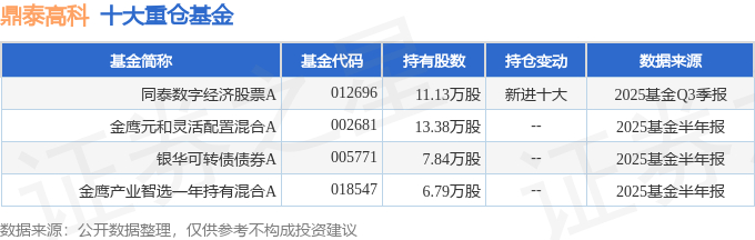 持有鼎泰高科最多的基金为同泰数字经济股票A,目前规模为0.62亿元,最新净值1.1868(10月24日),较上一交易日上涨6.39%,近一年上涨88.2%。该基金现任基金经理为陈宗超。