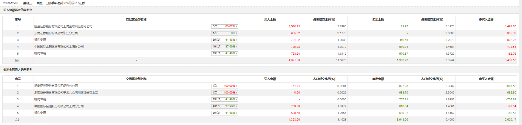 12月8日,天键股份今日涨14.31%,全天换手率达32.65%,振幅达15.15%。龙虎榜数据显示,营业部席位合计净买入639.45万元。其中,机构买入2071.96万元,卖出2047.31万元,合计净买入24.65万元。此外,国金证券上海互联网证券分公司、东海证券浙江分公司分别买入1580.73万元、905.82万元;浙商证券绍兴分公司、浙商证券宁波北仑明州路证券营业部分别卖出997.23万元、983.70万元。