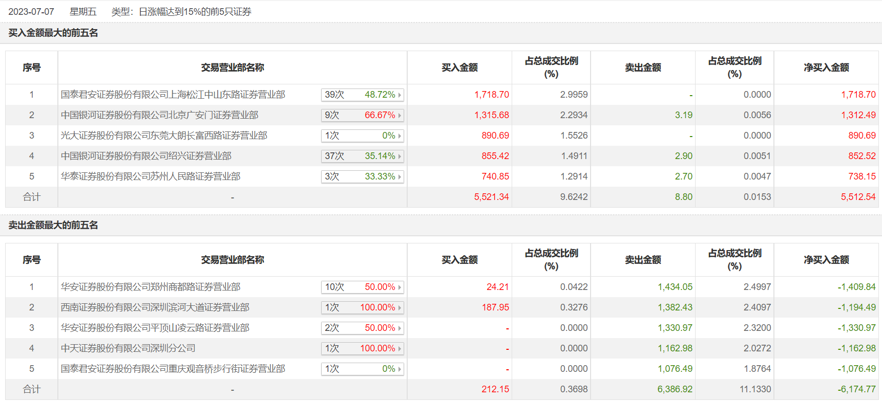 星源卓镁7月7日涨停,龙虎榜数据显示,上榜营业部席位全天成交1.21亿元,占当日总成交金额比例为21.14%。其中,买入金额为5733.49万元,卖出金额为6395.72万元,合计净卖出662.22万元。