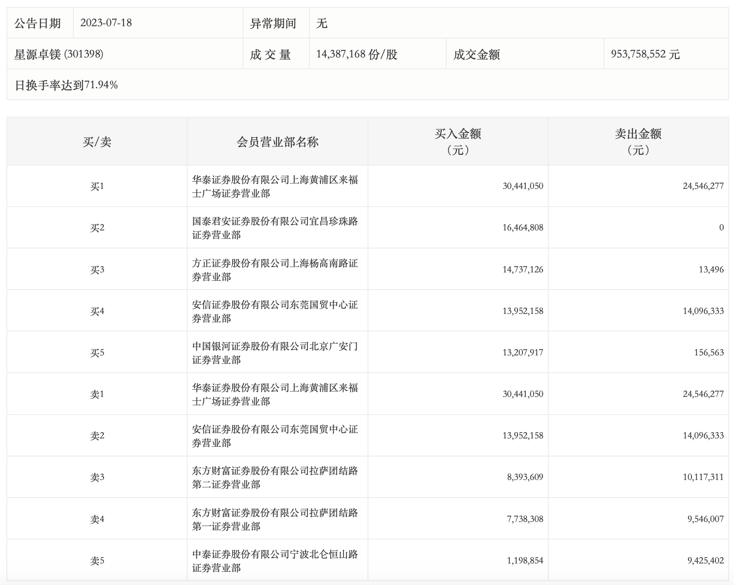 7月18日,星源卓镁今日涨停,龙虎榜数据显示,上榜营业部席位全天成交1.74亿元,占当日总成交金额比例为18.25%。其中,买入金额为1.06亿元,卖出金额为6790.14万元,合计净买入3823.24万元。