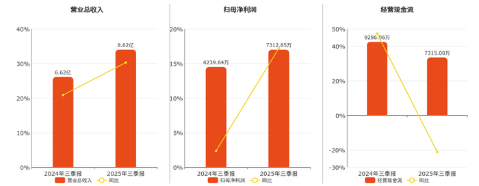 公司营业总收入为8.62亿元。归母净利润为7312.85万元。经营活动现金净流入为7315.00万元,较去年同报告期经营活动现金净流入减少1971.06万元,同比较去年同期下降21.23%。