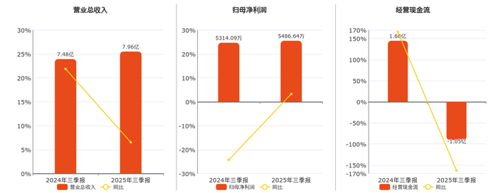 公司营业总收入为7.96亿元。归母净利润为5486.64万元。经营活动现金净流入为-1.05亿元,较去年同报告期经营活动现金净流入减少2.74亿元,同比较去年同期下降162.70%。