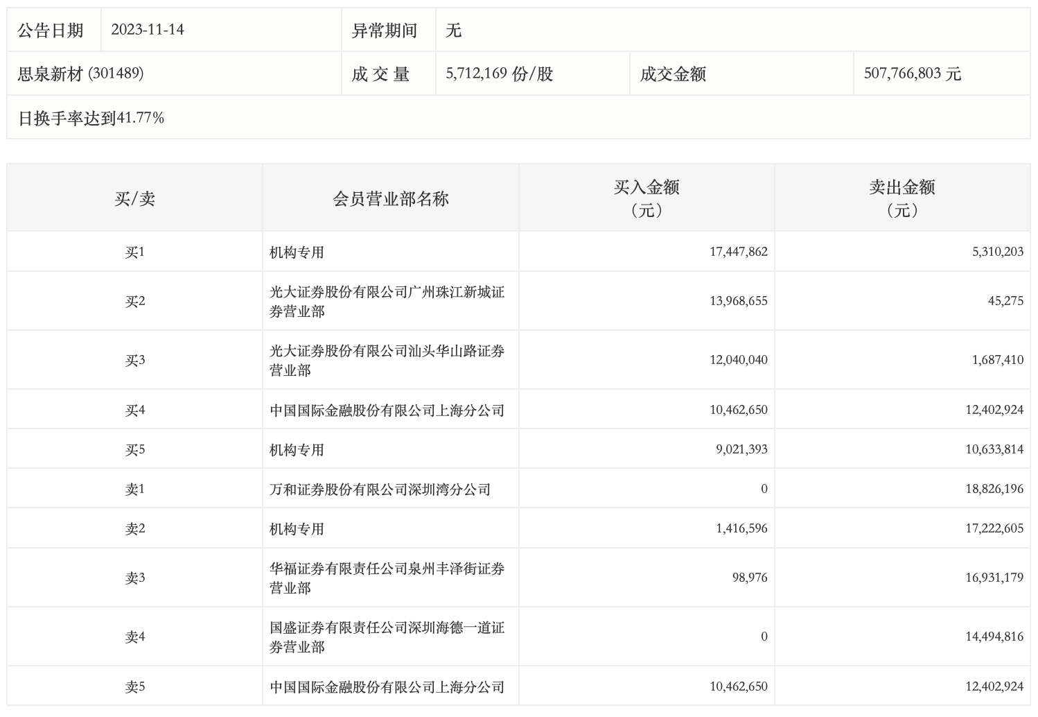 11月14日,思泉新材今日跌8.89%,全天换手率达41.77%,振幅达10.23%。龙虎榜数据显示,营业部席位合计净卖出3309.82万元。其中,机构买入2788.59万元,卖出3316.66万元,合计净卖出528.08万元。此外,万和证券深圳湾分公司、华福证券泉州丰泽街证券营业部分别卖出1882.62万元、1693.12万元;光大证券(维权)广州珠江新城证券营业部、光大证券汕头华山路证券营业部分别买入1396.87万元、1204.00万元。