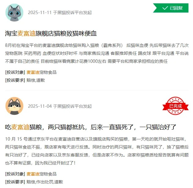 图源:黑猫投诉[下载黑猫投诉客户端]平台不过除了在营销端的持续投入外,围绕在乖宝宠物身边的质疑声也多次出现。社媒平台上有消费者表示,自己家里养了三年的宠物猫在吃了麦富迪猫粮后没几天突然离世、狗粮开封后有明显异味…黑猫投诉平台上针对麦富迪的投诉量也有750条,其中有不少集中在食品安全问题上。