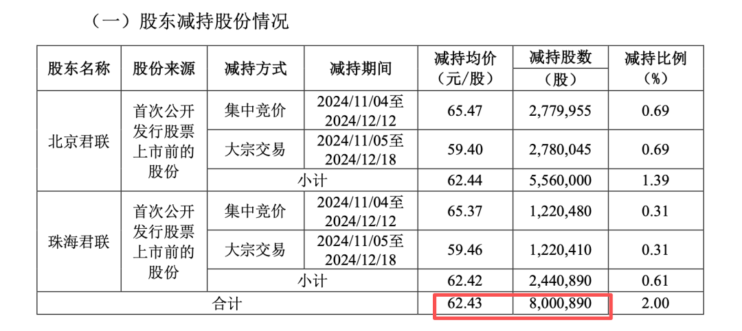据同花顺iFinD信息,2024年10月,二者计划合计减持不超过800.09万股股份,最终于2024年12月实施完毕。期间北京君联累计减持556万股,珠海君联累计减持244.09万股,以均价62.43元/股的价格计算,其上轮减持“套现”近5亿元。