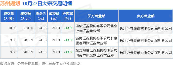 10月27日苏州规划现3笔折价13.03%的大宗交易 合计成交614.08万元
