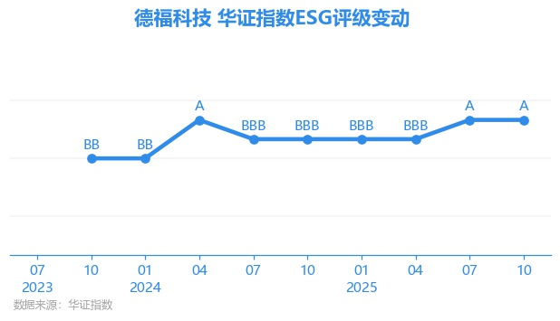 日前,华证指数公布了新一期(2025年10月31日)的ESG评级结果,德福科技(301511.SZ)获得A评级(华证指数评级为C起至AAA九档,C为最低档,AAA为其最高一级评级/AA为其第二档),上一期(2025年7月31日)ESG评级为A。本期ESG评级在330家电气设备行业A股上市公司中排名第58(上一期排名第65)。