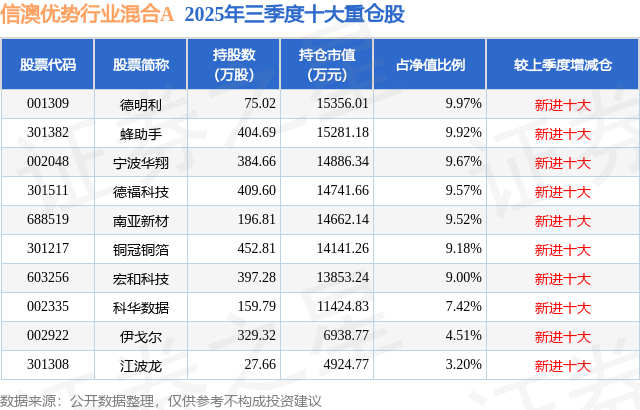 根据2025基金Q3季报公募基金重仓股数据,重仓该股的公募基金共13家,其中持有数量最多的公募基金为信达澳亚基金的信澳优势行业混合A。信澳优势行业混合A目前规模为14.49亿元,最新净值1.417(12月18日),较上一交易日下跌3.03%。该公募基金现任基金经理为吴清宇。吴清宇在任的基金产品包括:信澳景气优选混合A,管理时间为2021年12月21日至今,期间收益率为73.16%;信澳优势产业混合A,管理时间为2023年5月29日至今,期间收益率为139.14%;信澳周期动力混合A,管理时间为2024年11月29日至今,期间收益率为54.88%;信澳匠心严选一年持有混合A,管理时间为2024年11月29日至今,期间收益率为101.74%。