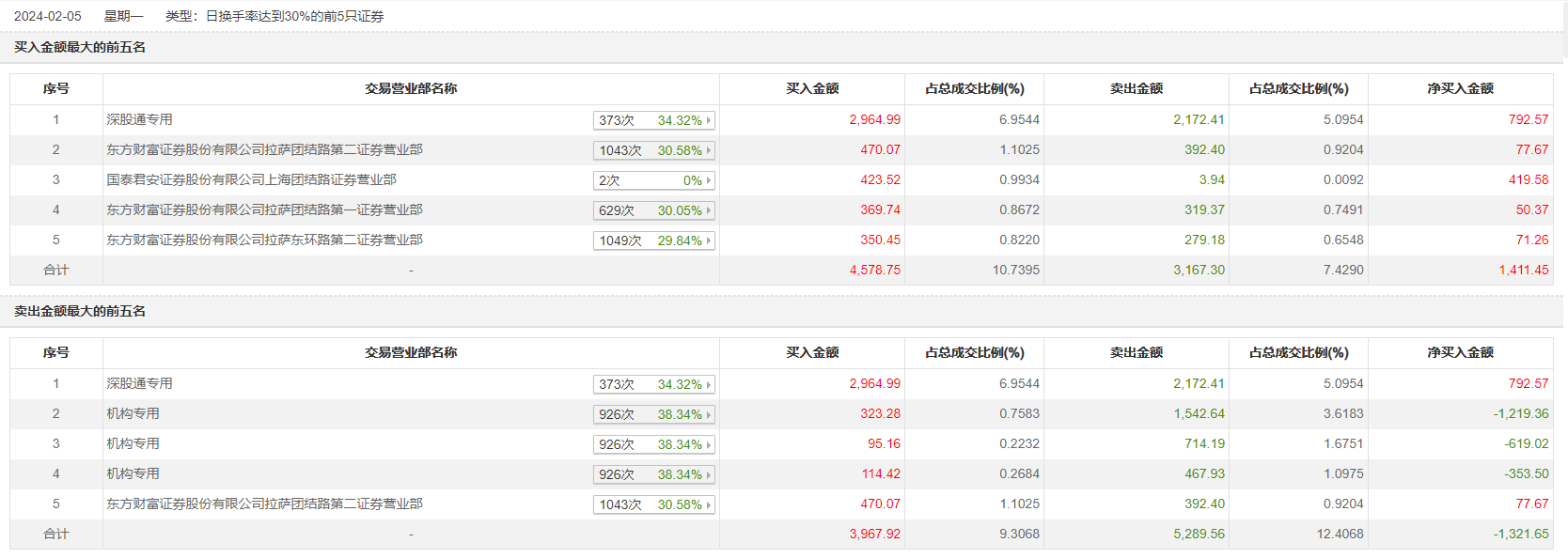 2月5日,中远通今日跌17.82%,全天换手率达35.2%,振幅达16.25%。龙虎榜数据显示,营业部席位合计净卖出780.44万元。其中,机构买入532.87万元,卖出2724.76万元,合计净卖出2191.89万元。此外,深股通专用、东方财富证券拉萨团结路第二证券营业部分别卖出2172.41万元、392.40万元;深股通专用、东方财富证券拉萨团结路第二证券营业部分别买入2964.99万元、470.07万元。