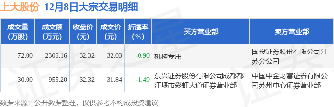 12月8日上大股份现2笔大宗交易 机构净买入2306.16万元
