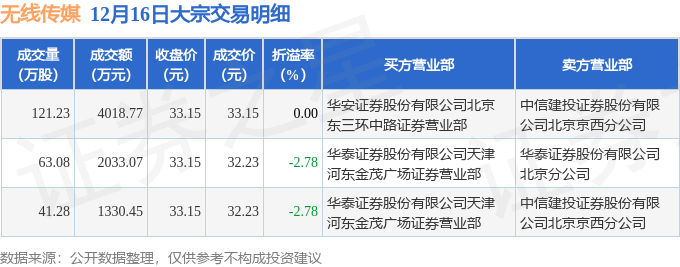 证券之星消息,12月16日无线传媒发生大宗交易,交易数据如下: