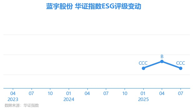 日前,华证指数公布了新一期(2025年7月31日)的ESG评级结果,蓝宇股份(301585.SZ)获得CCC评级(华证指数评级为C起至AAA九档,C为最低档,AAA为其最高一级评级/AA为其第二档),上一期(2025年4月30日)ESG评级为B。本期ESG评级在462家化学制品行业A股上市公司中排名第290(上一期排名第300)。