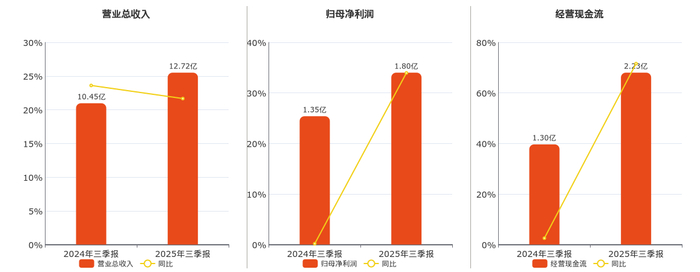 公司营业总收入为12.72亿元。归母净利润为1.80亿元。经营活动现金净流入为2.23亿元。