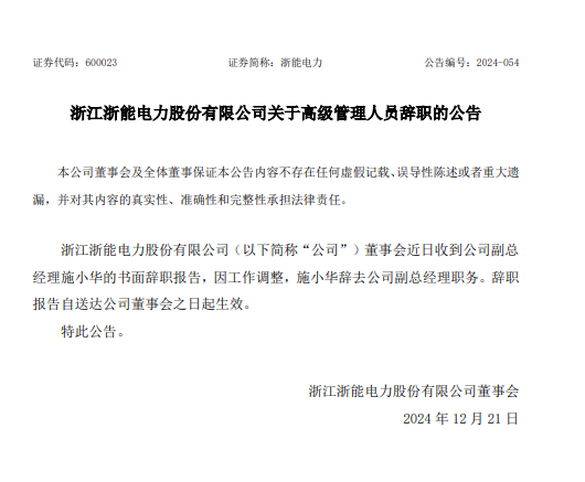 12月21日,浙能电力发布公告称,公司董事会近日收到公司副总经理施小华的书面辞职报告,因工作调整,施小华辞去公司副总经理职务。辞职报告自送达公司董事会之日起生效。