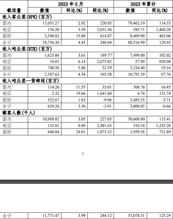 南方航空:前5月载客人数合计5307.83万人,同比上涨123.29%
