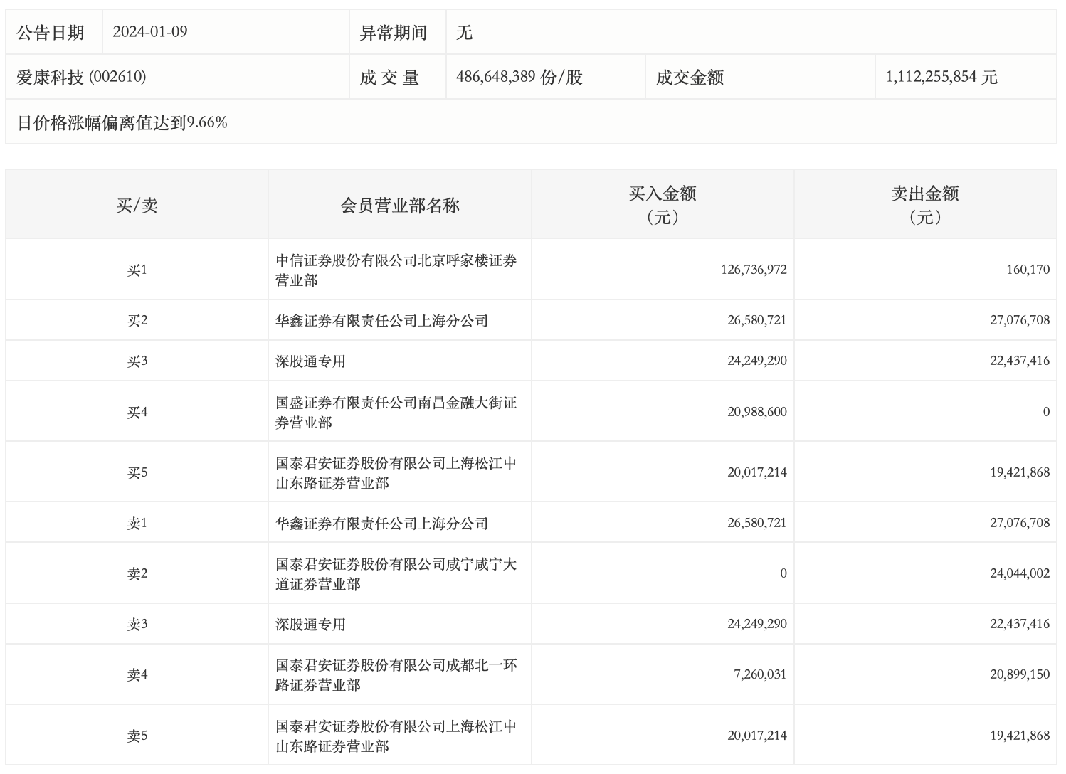 龙虎榜丨爱康科技今日涨停,中信证券北京呼家楼席位净买入1.27亿元