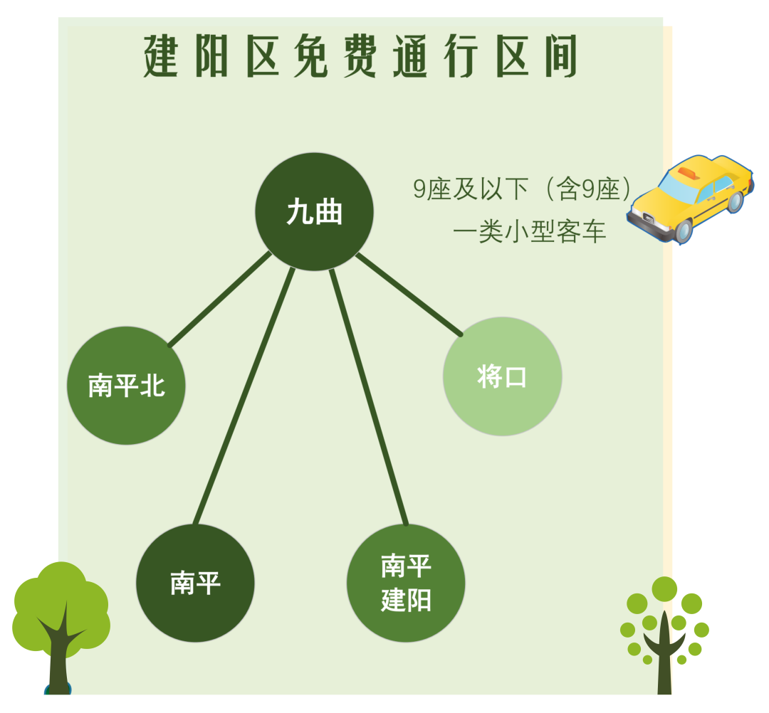 建阳区:9座及以下(含9座)一类小型客车,已办理并使用ETC通行,未欠缴高速公路通行费,且通行里程等于两个收费站间收费里程的,在建阳区南平建阳、南平、南平北、将口4个高速公路收费站至九曲收费站之间点对点通行的高速公路免收通行费。
