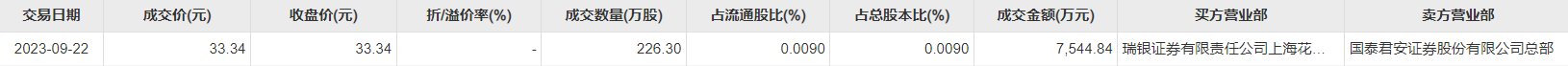 9月22日大宗交易成交226.3万股,成交额7544.84万元,占当日总成交额的3.11%,成交价33.34元,较市场收盘价33.34元持平。