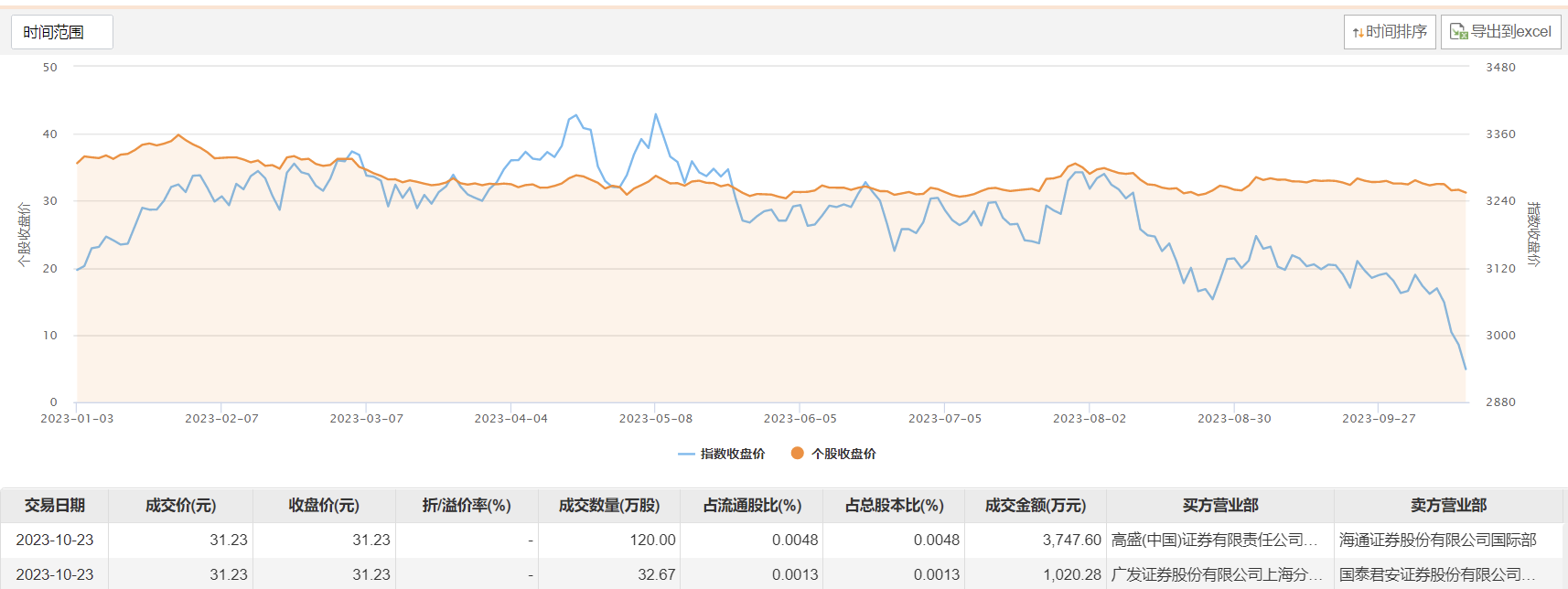 收跌1.33%,收盘价为31.23元,发生2笔大宗交易,合计成交量152.67万股,成交金额4767.88万元。