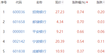 中国银行、交通银行、苏州银行、农业银行、民生银行和浦发银行位列涨幅榜后五位,涨幅分别为-1.76%、-1.55%、-1.24%、-1.10%、-1.05%和-1.05%。