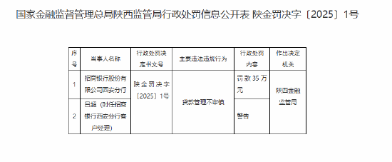 招商银行西安分行因贷款管理不审慎被罚35万元