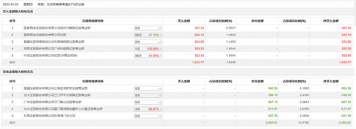 具体来看,国融证券上海金龙新街证券营业部、光大证券(维权)江门开平光明路证券营业部分别卖出963.56万元、788.10万元;国泰君安证券临沂沂蒙路证券营业部、国泰君安证券总部分别买入481.34万元、342.14万元。