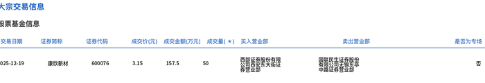 12月19日,康欣新材大宗交易成交50万股,成交额157.5万元,占当日总成交额的0.51%,成交价3.15元,较市场收盘价3.15元持平。