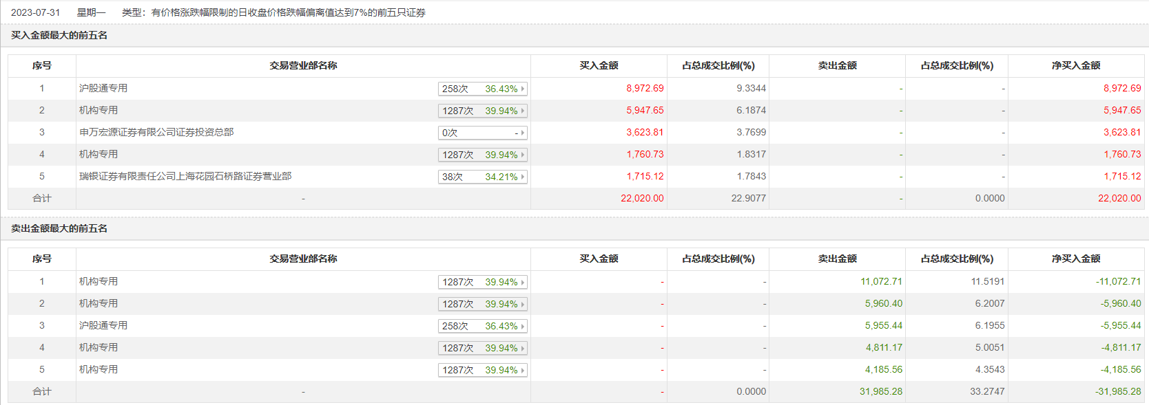 7月31日,人福医药今日跌7.15%,龙虎榜数据显示,上榜营业部席位全天成交5.4亿元,占当日总成交金额比例为56.18%。其中,买入金额为2.2亿元,卖出金额为3.2亿元,合计净卖出9965.28万元。