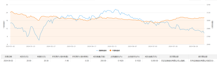 9月2日大宗交易成交250万股,成交额5000万元,占当日总成交额的15.85%,成交价20元,较市场收盘价20.3元折价1.48%。