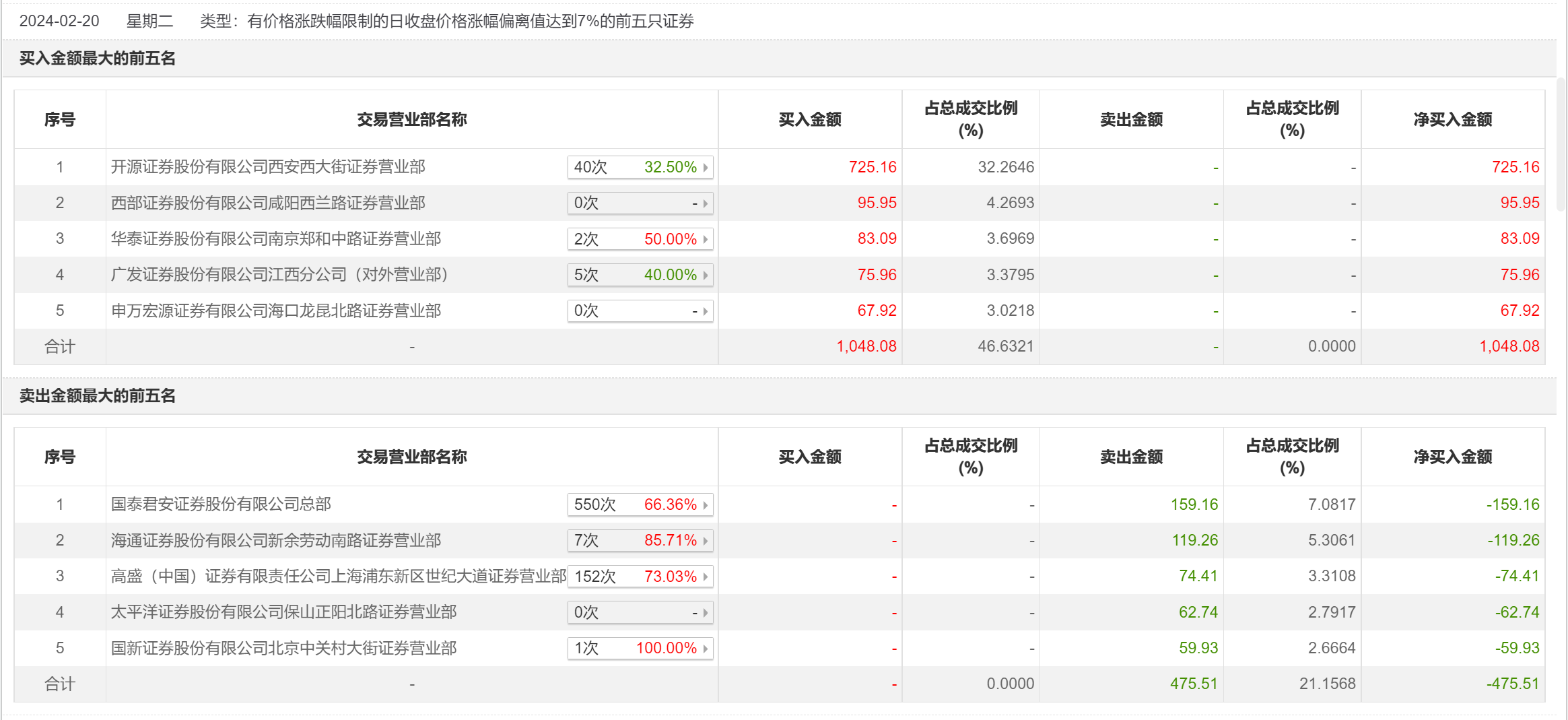 具体来看,开源证券西安西大街证券营业部、西部证券咸阳西兰路证券营业部分别买入725.16万元、95.95万元;国泰君安证券总部、海通证券新余劳动南路证券营业部分别卖出159.16万元、119.26万元。