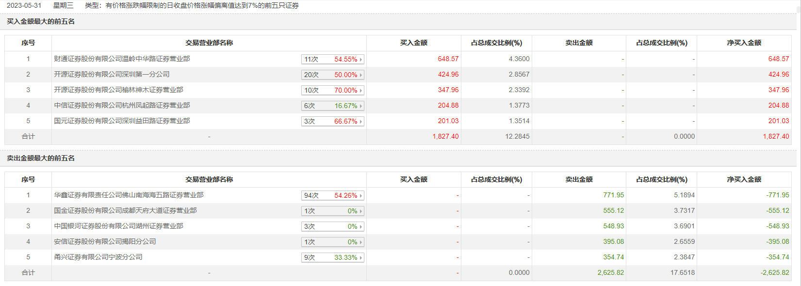 具体来看,财通证券温岭中华路证券营业部、开源证券深圳第一分公司分别买入648.57万元、424.96万元;华鑫证券佛山南海海五路证券营业部、国金证券成都天府大道证券营业部分别卖出771.95万元、555.12万元。