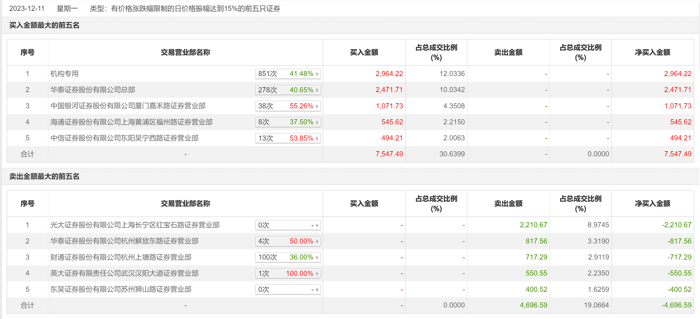 12月11日,博信股份今日涨停,全天换手率达13.06%,振幅达15.45%。龙虎榜数据显示,营业部席位合计净买入2850.9万元。其中,机构合计净买入2964.22万元。此外,华泰证券总部、中国银河证券厦门嘉禾路证券营业部分别买入2471.71万元、1071.73万元;光大证券(维权)上海长宁区红宝石路证券营业部、华泰证券杭州解放东路证券营业部分别卖出2210.67万元、817.56万元。