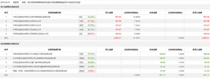 具体来看,中泰证券常州惠国路证券营业部、开源证券深圳分公司分别买入837.95万元、497.98万元;华泰证券上海牡丹江路证券营业部、东方财富证券山南香曲东路证券营业部分别卖出106.08万元、105.97万元。