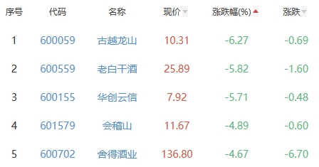 古越龙山、老白干酒、华创云信、会稽山、舍得酒业位列涨幅榜后五位,涨幅分别为-6.27%、-5.82%、-5.71%、-4.89%、-4.67%。