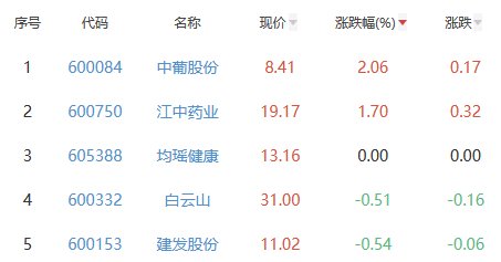 其中,中葡股份、江中药业、均瑶健康、白云山、建发股份位列板块涨幅前五位,涨幅分别为2.06%、1.70%、0.00%、-0.51%、-0.54%。