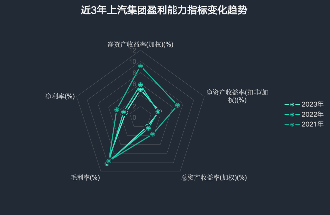 而在这背后,上汽集团更为深切的焦虑或许是:如果再不跟上这个时代,恐怕就要掉队了。在最近5年里,上汽集团已有4年出现净利下滑,累计下滑比例达到95.88个百分点。即使用2021年上涨20.08%进行抵消,累计下滑也达到了75.8个百分点。相比于5年前的鼎盛时期,上汽集团的净利润可以说是“腰斩”。不仅如此,公司净资产收益率、净利率等多种盈利能力指标也出现收缩。