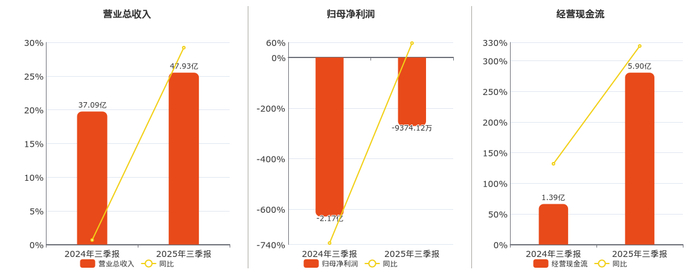 公司营业总收入为47.93亿元。归母净利润为-9374.12万元。经营活动现金净流入为5.90亿元。