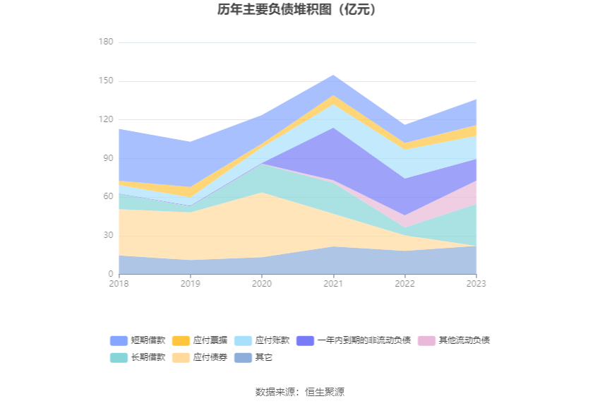 2023年,公司经营活动现金流净额为24.28亿元,同比下降48.79%,主要系公司销售商品、提供劳务收到的现金同比减少所致;筹资活动现金流净额1.61亿元,同比增加66.44亿元,主要系公司偿还到期有息债务同比减少>,同时新增长期借款和短期借款所致;投资活动现金流净额-18.23亿元,上年同期为-4.15亿元,主要系公司基建类、股权类投资支出同比增加所致。