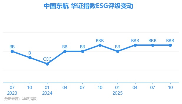 日前,华证指数公布了新一期(2025年10月31日)的ESG评级结果,中国东航(600115.SH)获得BBB评级(华证指数评级为C起至AAA九档,C为最低档,AAA为其最高一级评级/AA为其第二档),上一期(2025年7月31日)ESG评级为BBB。本期ESG评级在7家客运航空公司行业A股上市公司中排名第2(上一期排名第2)。
